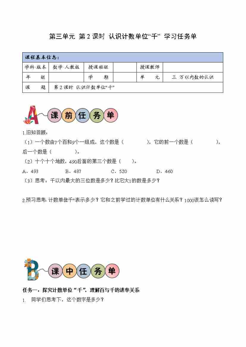 首页 > 全部 > 学习任务单 > 第三单元第2课时 认识计数单位“千”(学习任务单)(新教材)