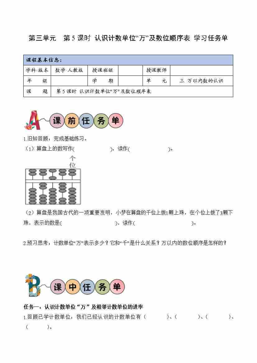 第三单元第5课时 认识计数单位“万”及数位顺序表(学习任务单)(新教材)