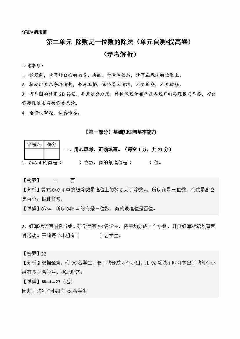 第二单元 除数是一位数的除法(单元自测•提高卷)(新教材)(参考解析)