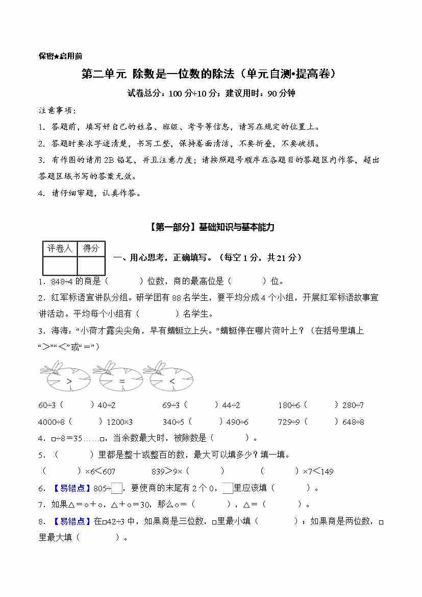 第二单元 除数是一位数的除法(单元自测•提高卷)(新教材)(A4版)
