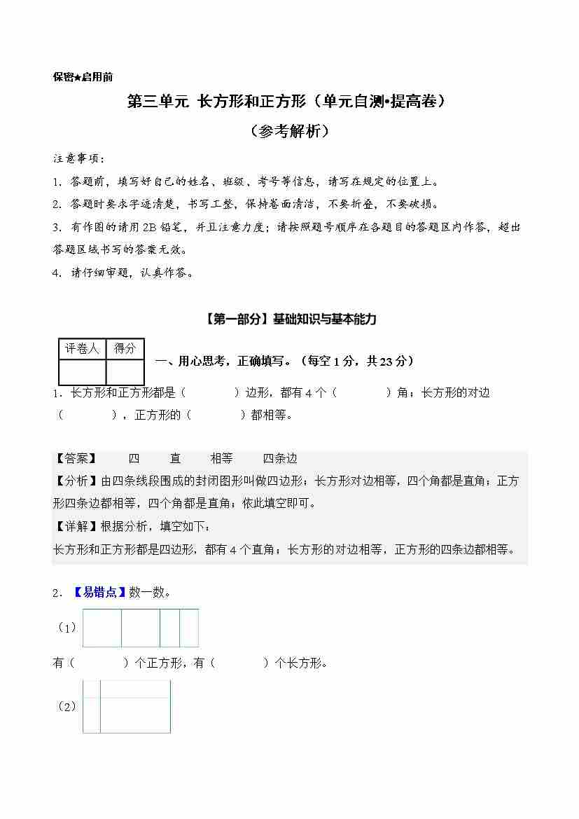第三单元 长方形和正方形(单元自测•提高卷)(新教材)(参考解析)