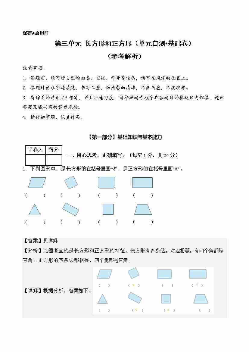 第三单元 长方形和正方形(单元自测•基础卷)(新教材)(参考解析)