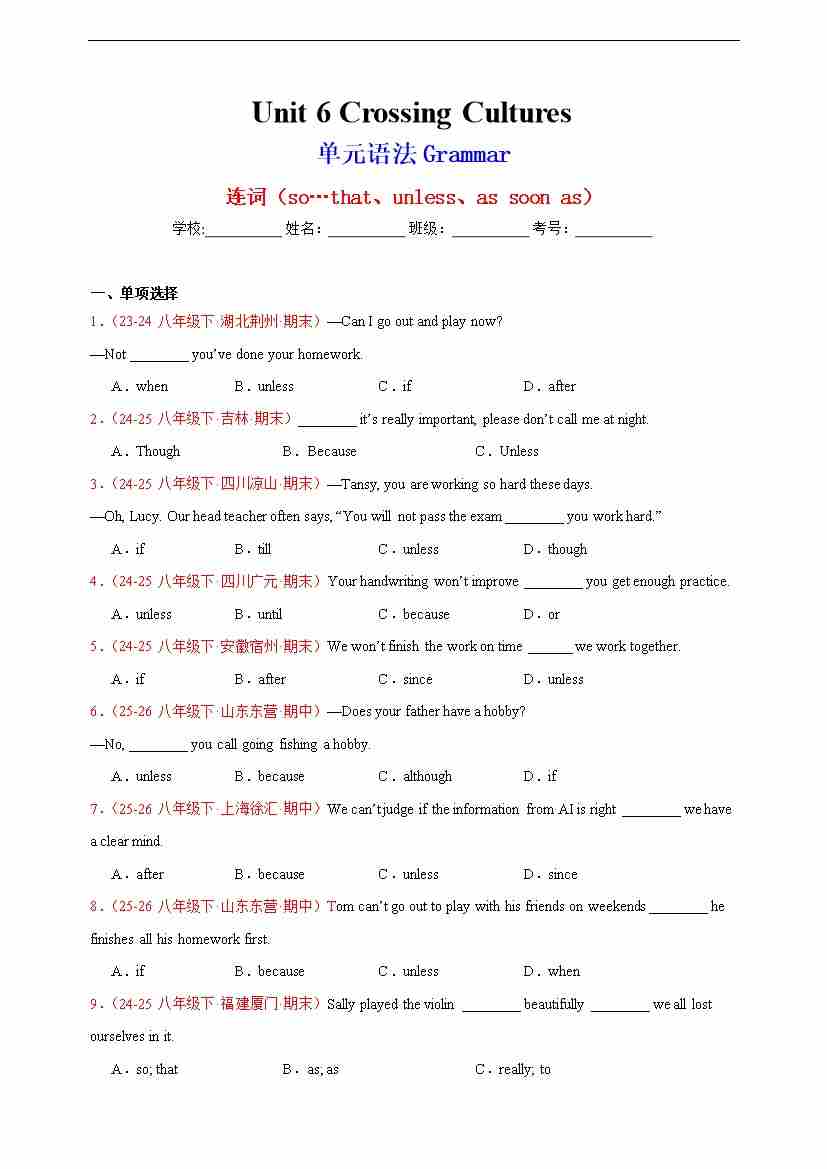 Unit 6 Crossing Cultures单元语法Grammar连词(so…that、unless、as soon as)