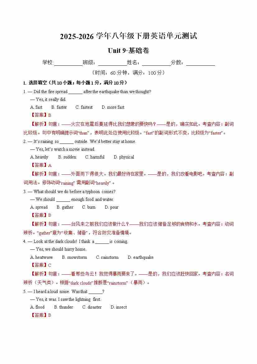 首页 > 全部 > 单元测试 > 八年级英语下册Unit9单元测试·基础卷(解析版)
