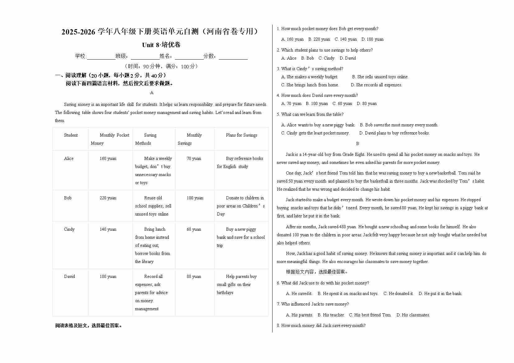 首页 > 全部 > 单元测试 > 八年级英语下册Unit 8 单元自测·河南省卷专用(考试版A3)