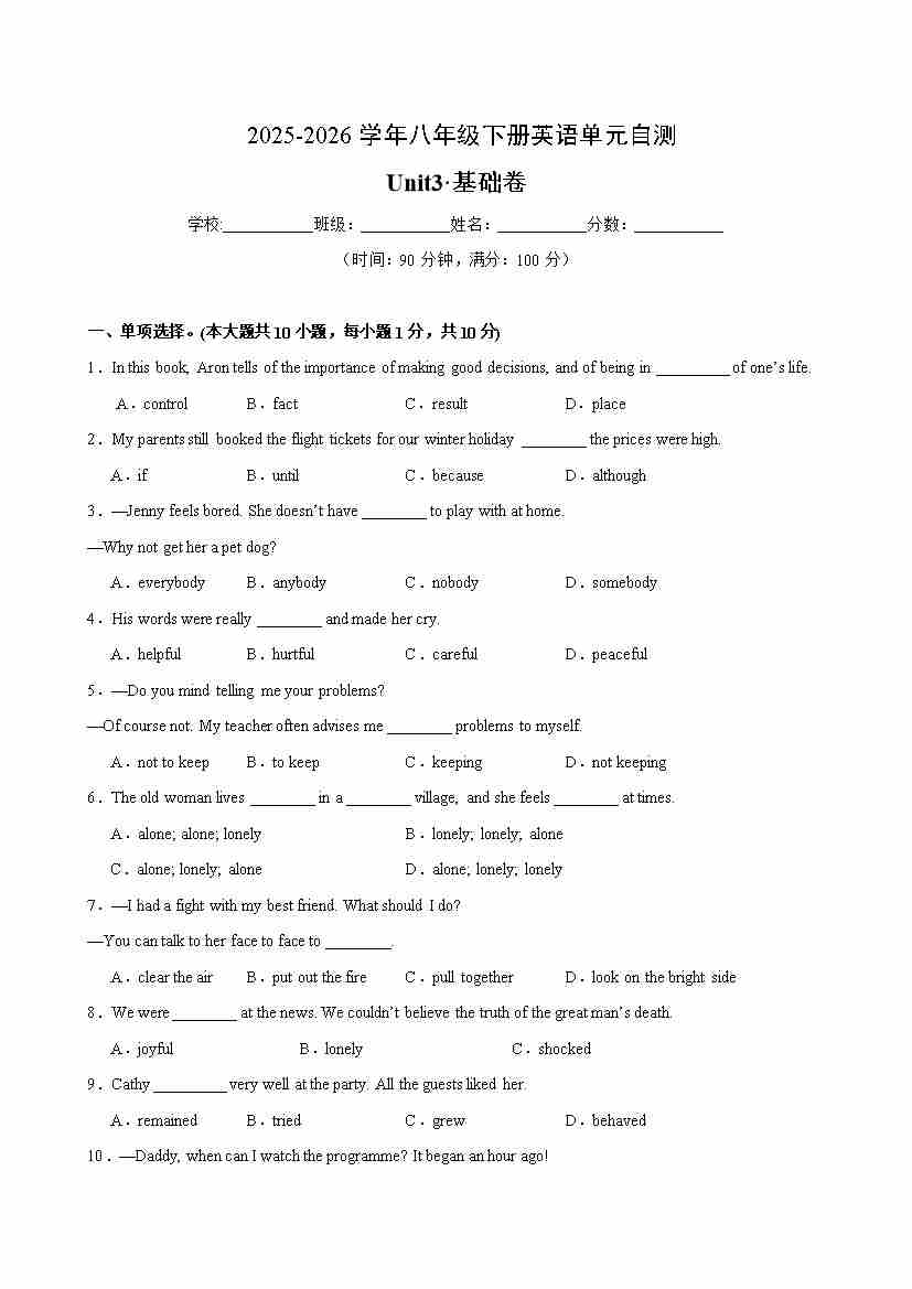 八年级英语下册Unit 3 单元自测·基础卷(试题版A4)