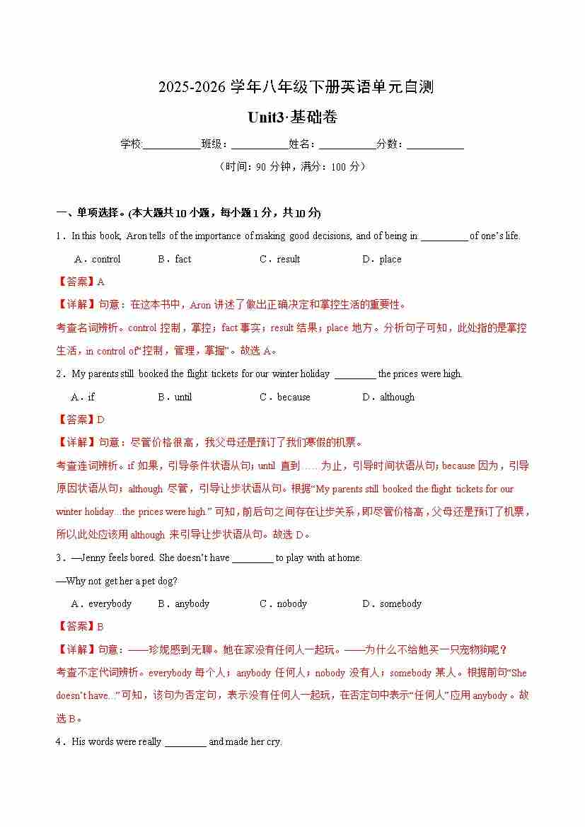 八年级英语下册Unit 3 单元自测·基础卷(解析版)