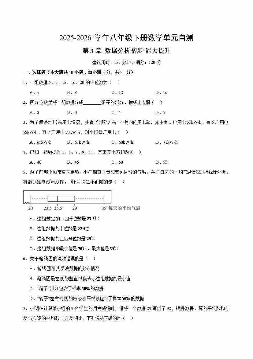 八下数学第3章 数据分析初步·提升卷(试题版A4)