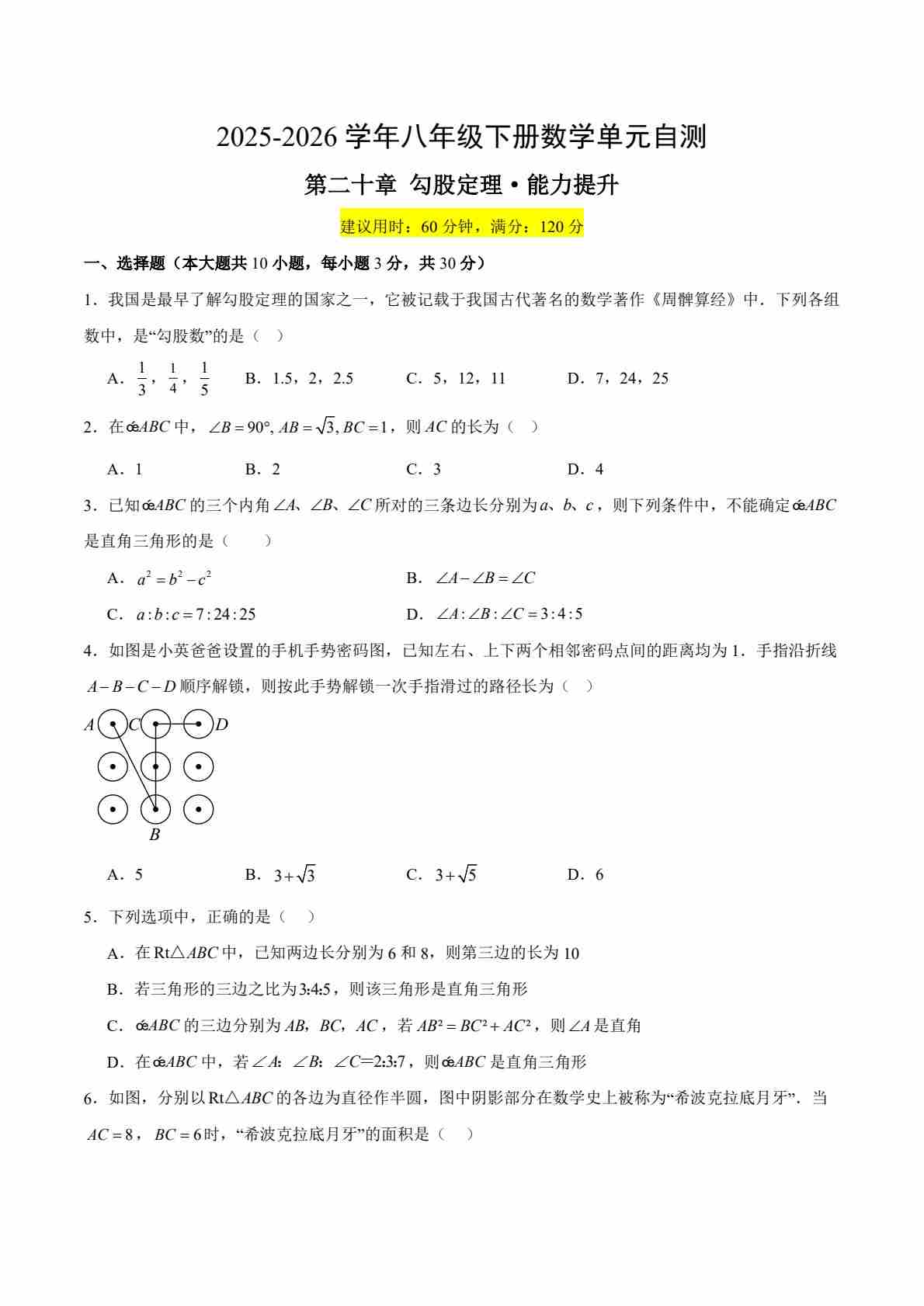 八下数学第二十章 勾股定理·提升卷(试题版A4)