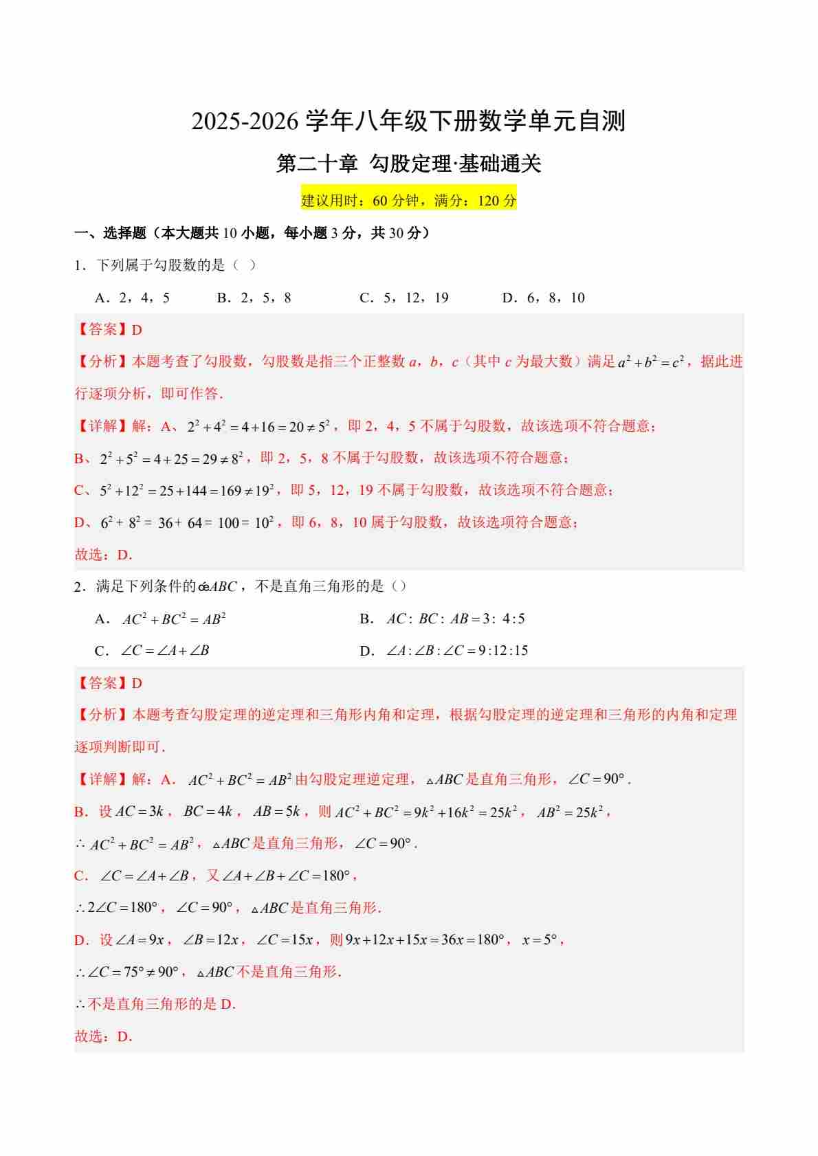 首页 > 全部 > 单元检测 > 八下数学第二十章 勾股定理·基础卷(解析版)1