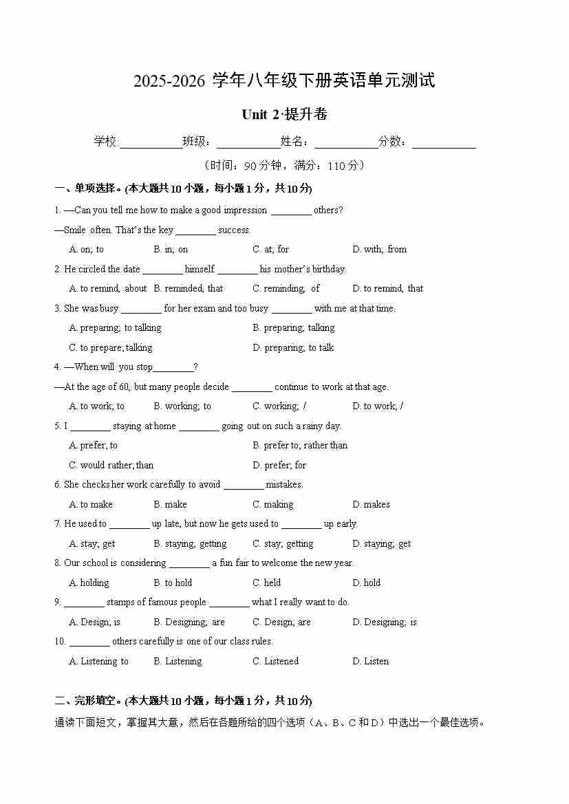 八年级英语下册Unit 2单元自测·提升卷(考试版A4)