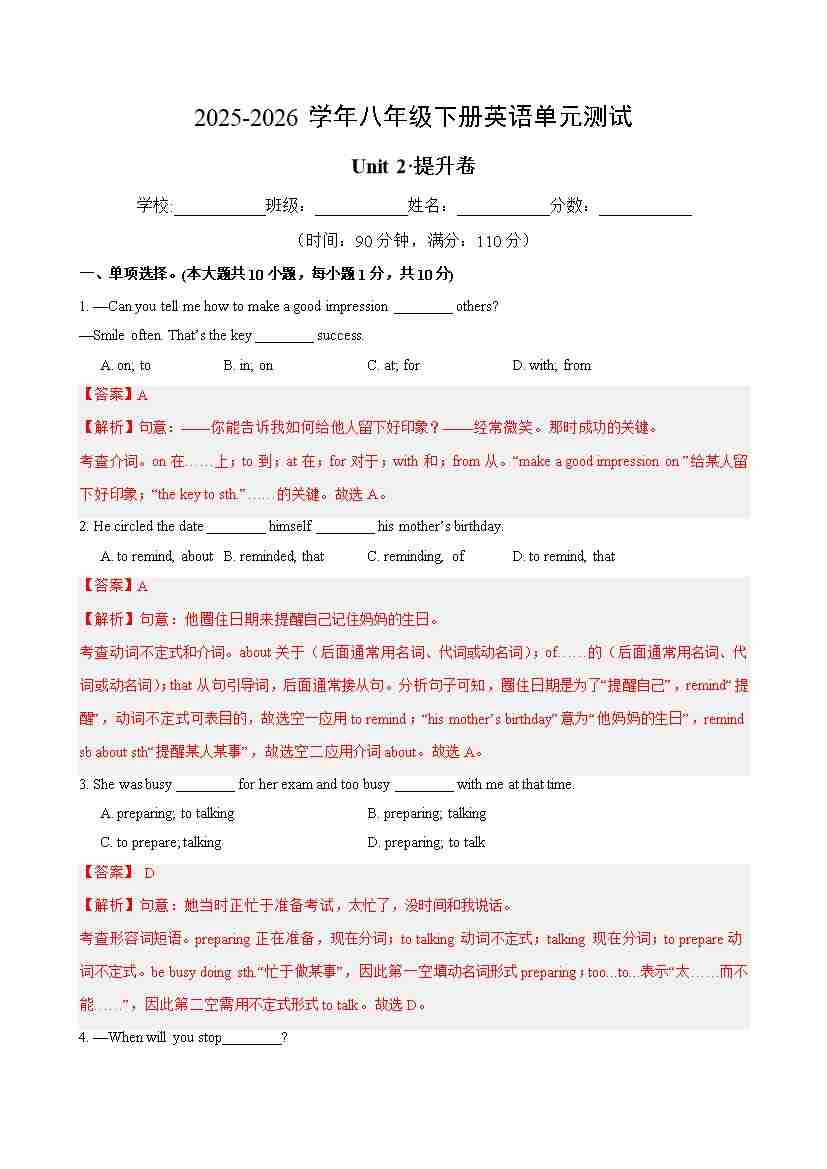 首页 > 全部 > 单元试卷 > 八年级英语下册Unit 2单元自测·提升卷(解析版)