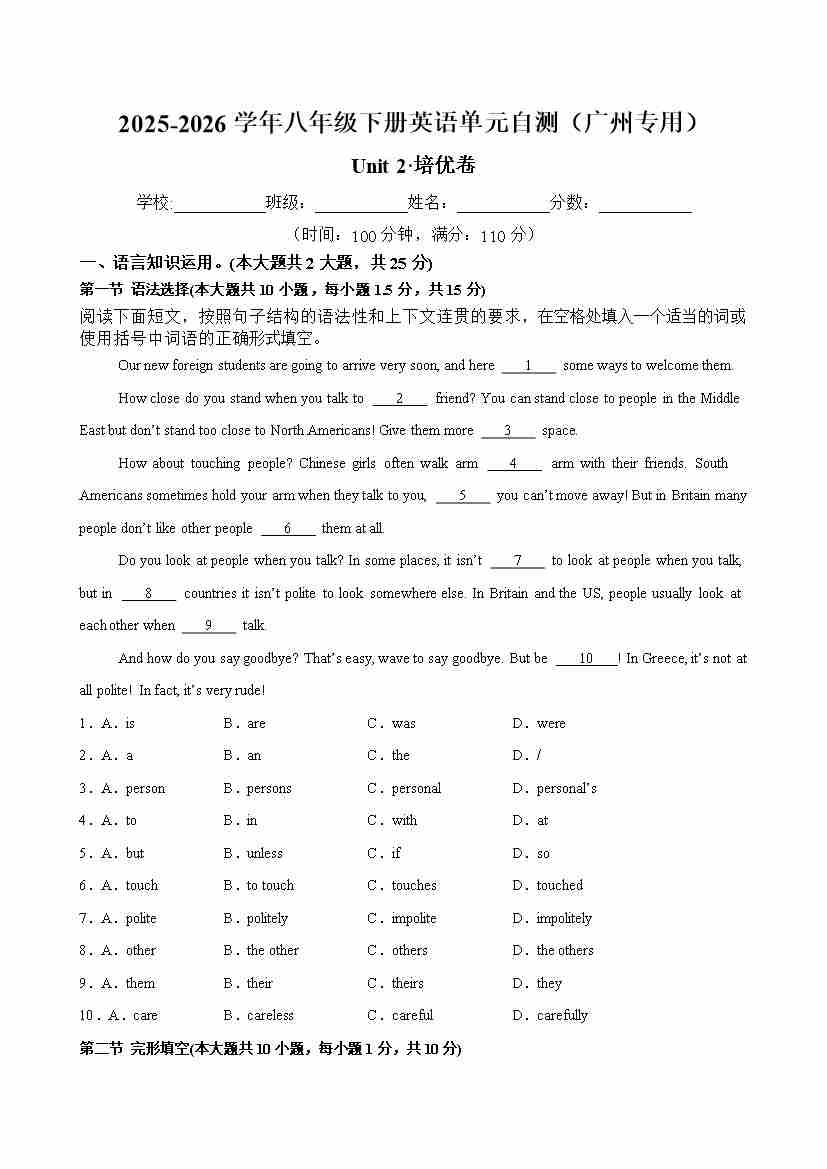 首页 > 全部 > 单元地区卷 > 八年级英语下册Unit 2 Body language (单元自测·广州专用)(考试版A4)