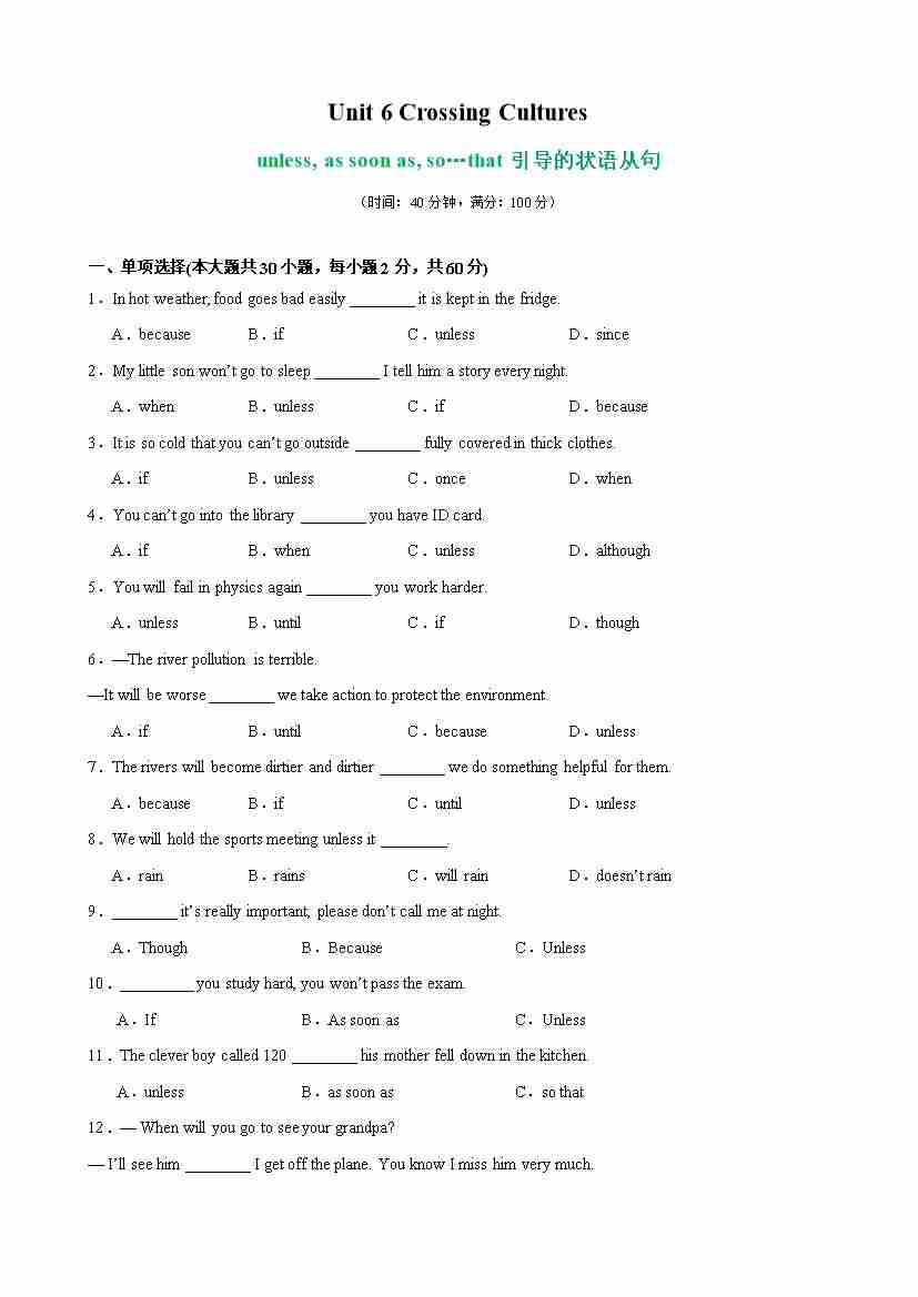 Unit 6 Crossing Cultures 单元语法(unless, as soon as, so…that引导的状语从句)(原卷版)