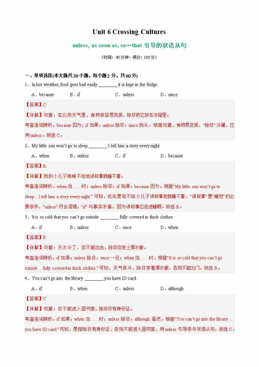 Unit 6 Crossing Cultures 单元语法(unless, as soon as, so…that引导的状语从句)(解析版)