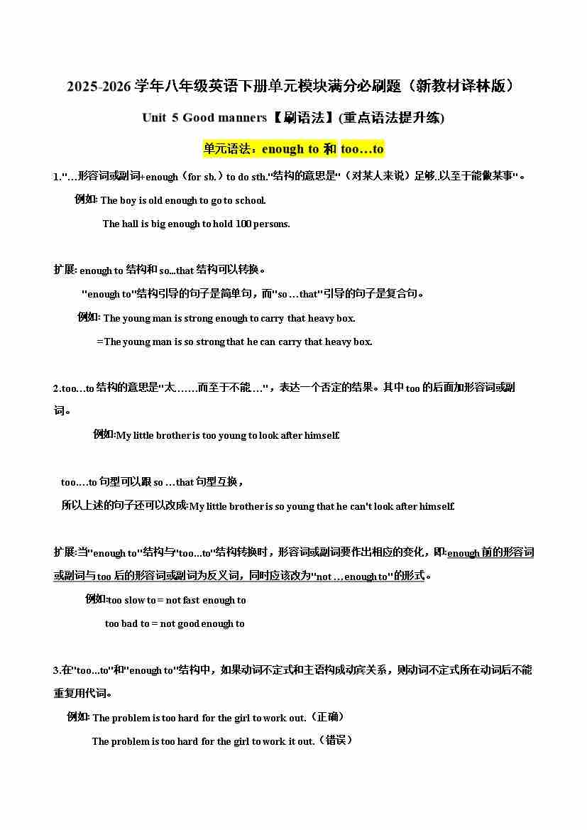 首页 > 全部 > 未知 Unit 5【刷语法】enough to 和too…to(重点语法提升练)(原卷版)(新教材译林版)