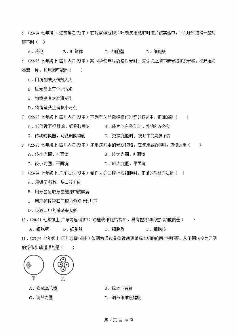 首页 > 全部 > 期中专项 > 专题02 认识细胞(原卷版)