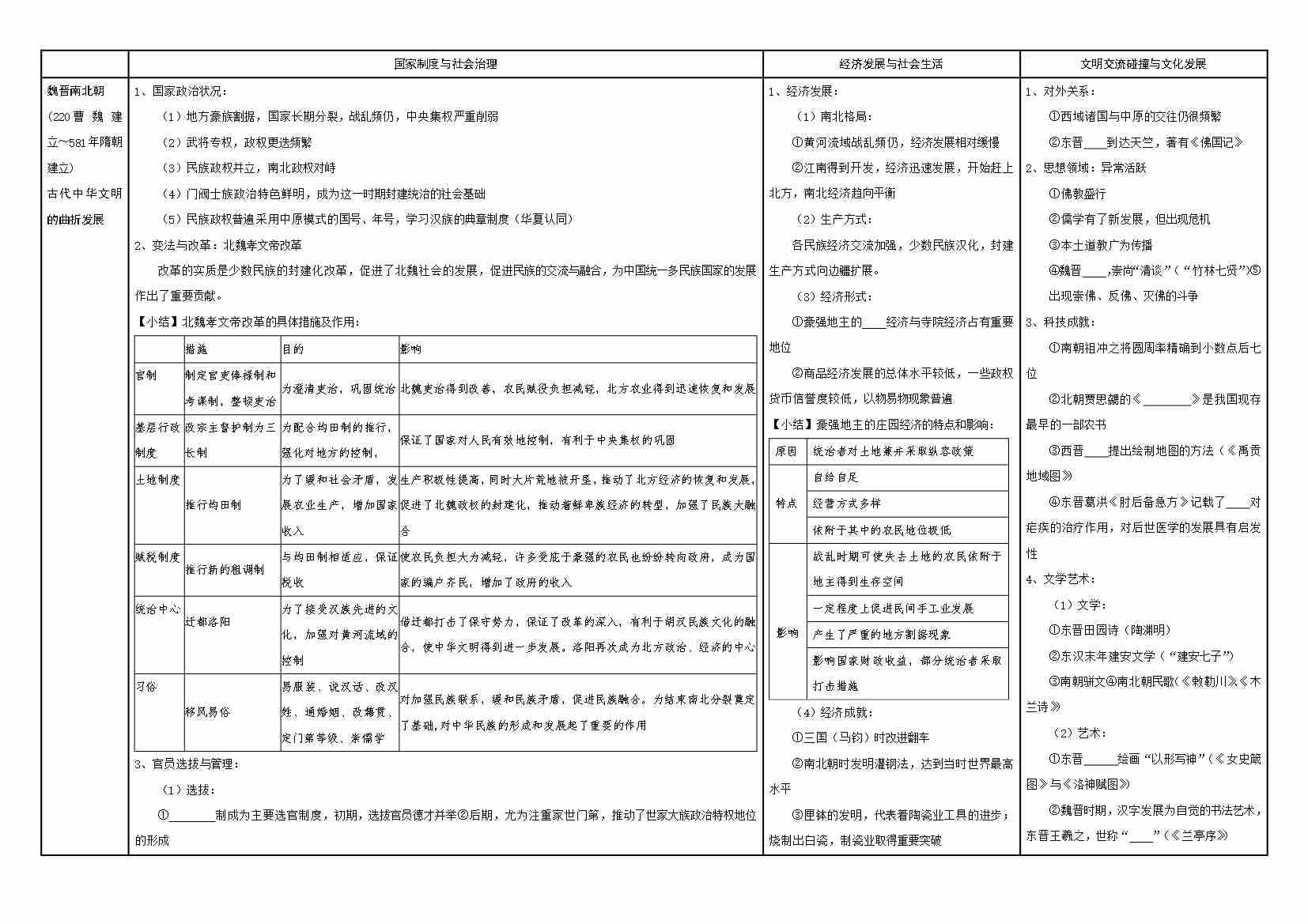 清单03 中国通史表格—魏晋南北朝(学生版)
