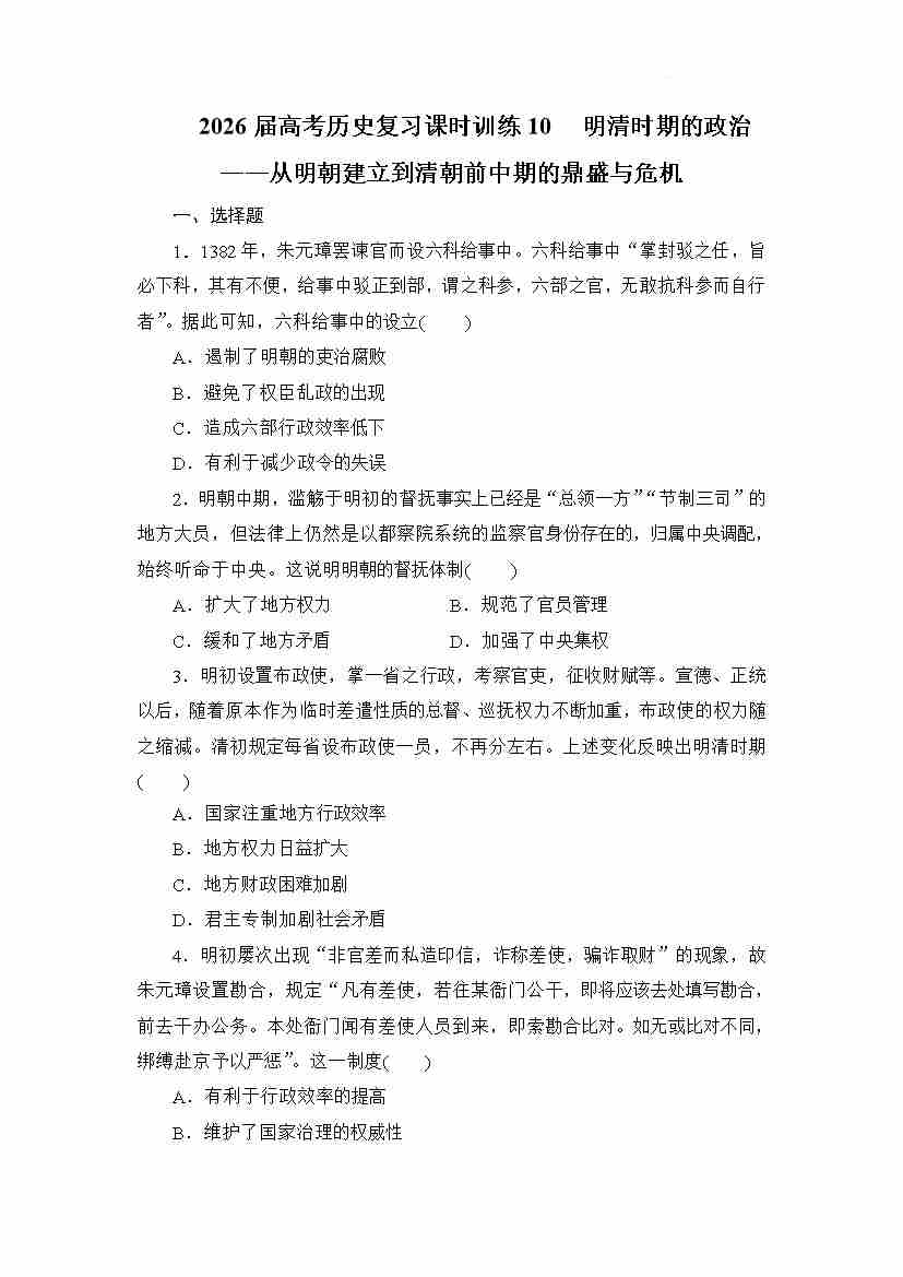 课时训练10 明清时期的政治——从明朝建立到清朝前中期的鼎盛与危机--2026届高三统编版(2019)必修中外历史纲要上一轮复习