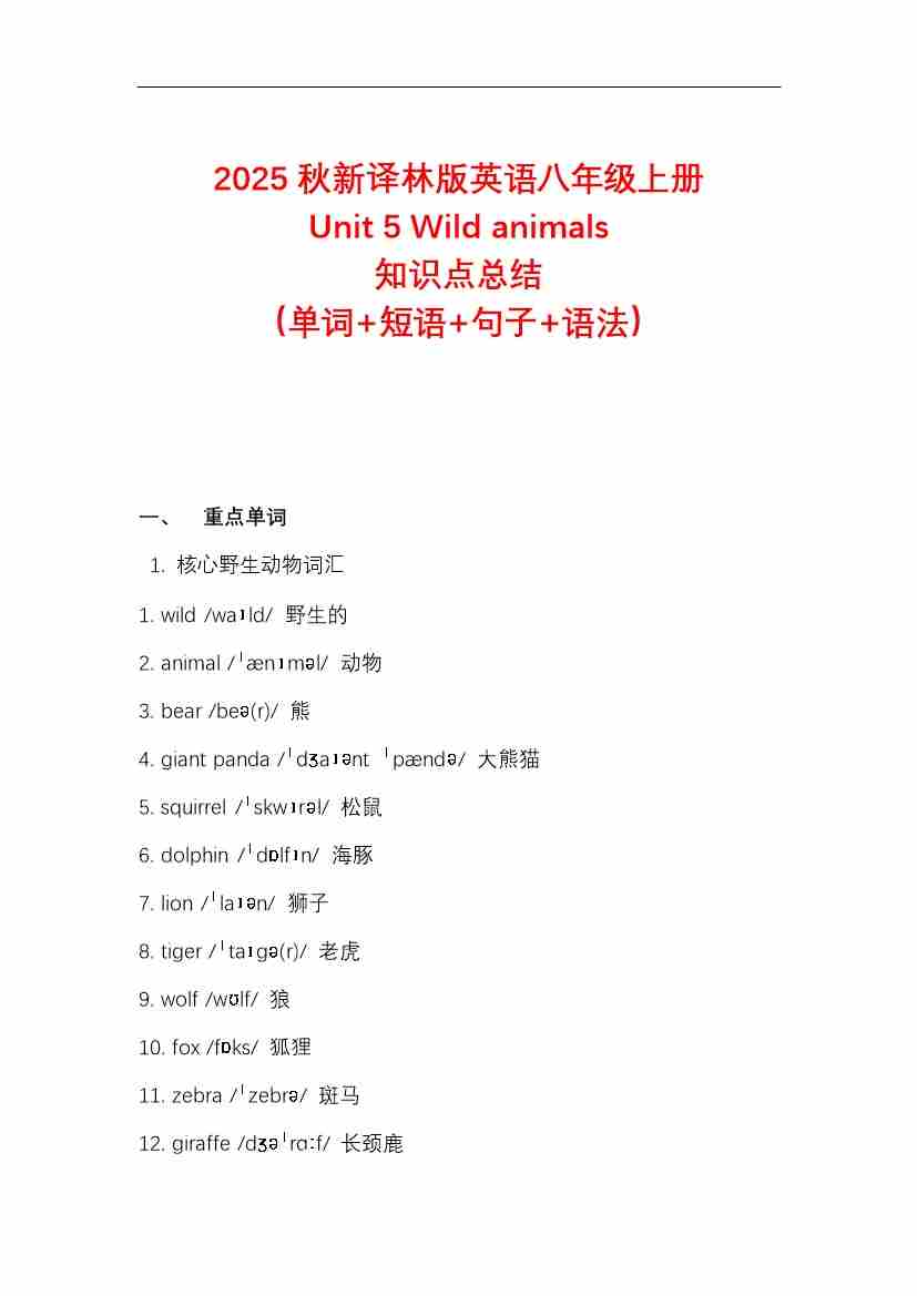 首页 > 全部 > 知识讲义 > Unit 5 Wild animals 知识点总结(单词 短语 句子 语法)—2025秋新译林版英语八年级上册