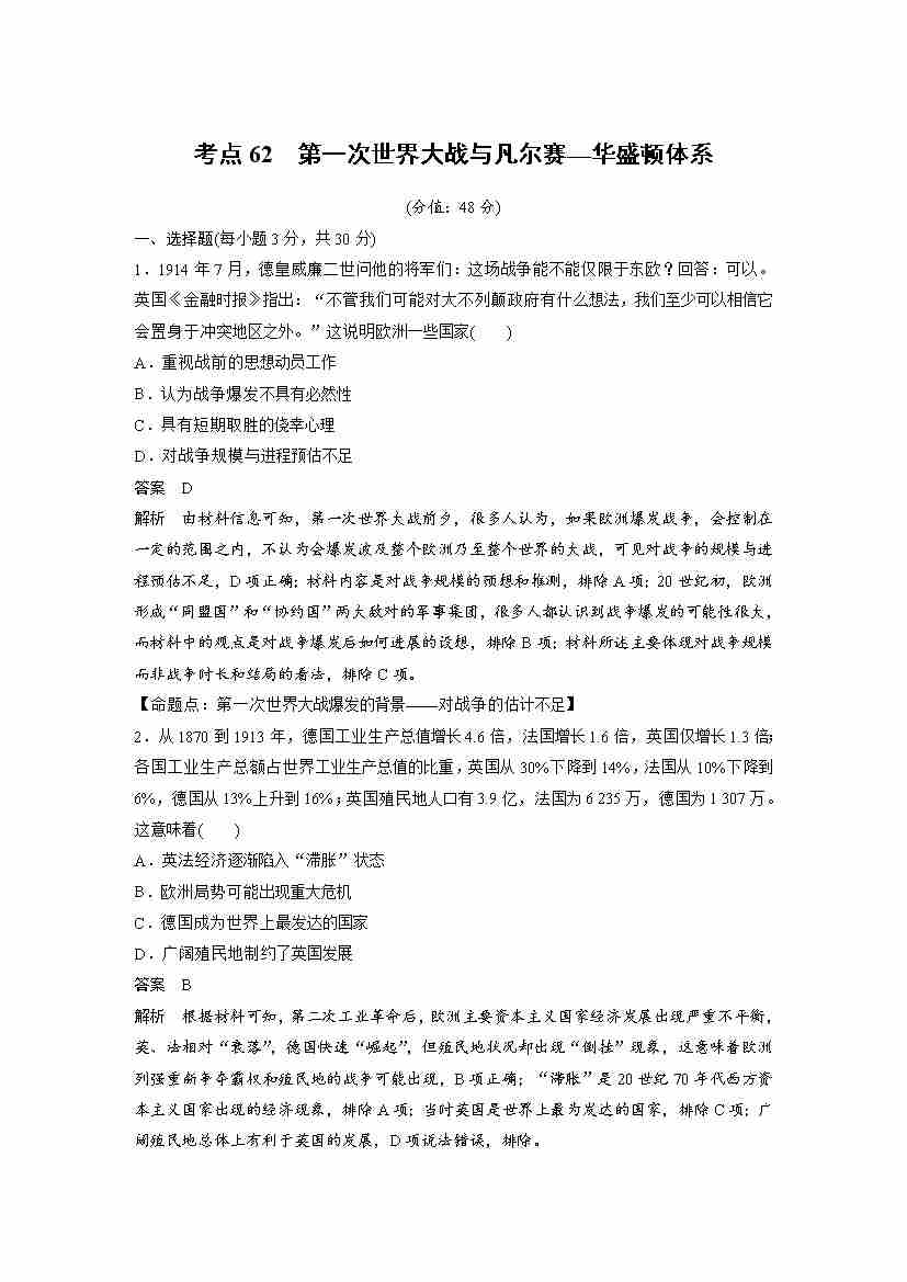 首页 > 全部 > 未知 考点62 第一次世界大战与凡尔赛—华盛顿体系(教师版)