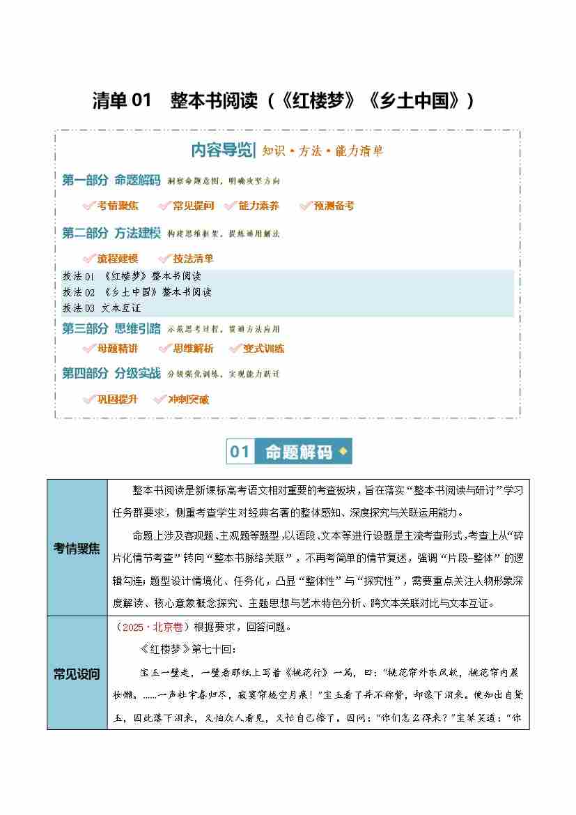 清单01 整本书阅读(《红楼梦》《乡土中国》)(知识·方法·能力清单)(教师版)