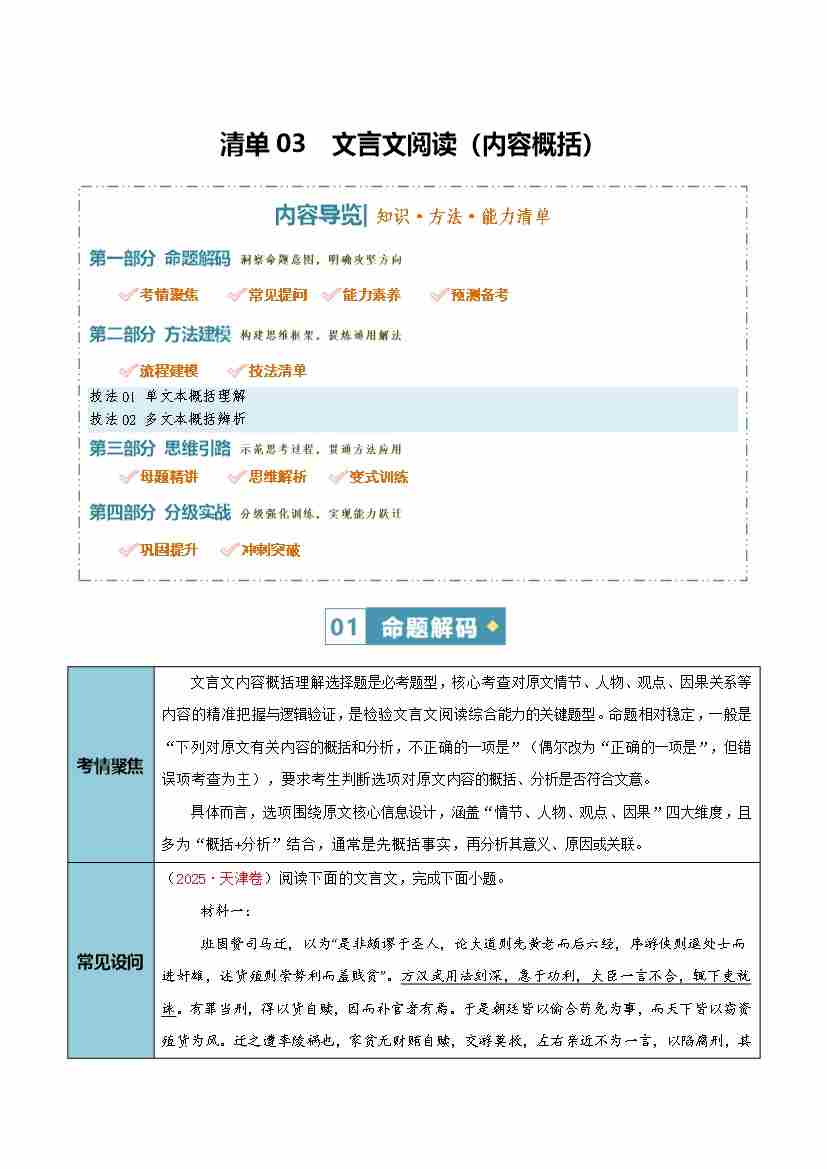 清单03 文言文阅读(内容概括)(知识·方法·能力清单)(全国通用)(学生版)