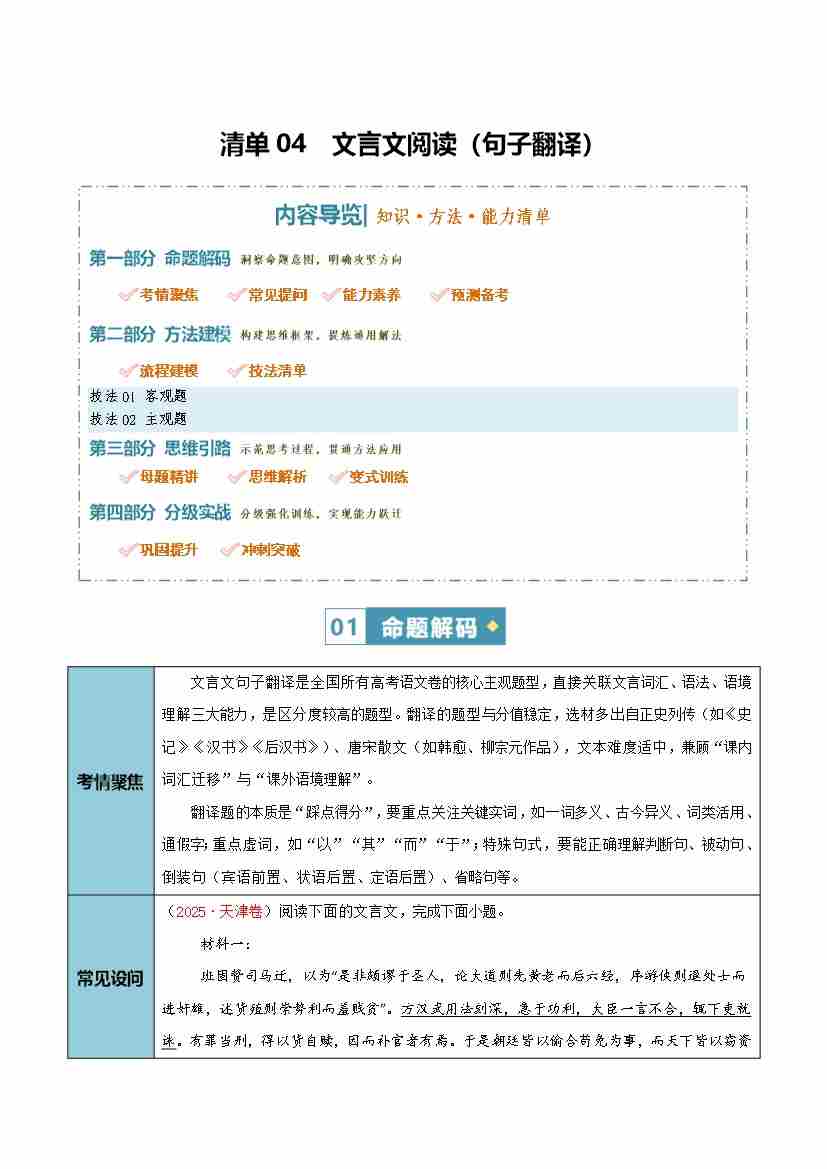 清单04 文言文阅读(句子翻译)(知识·方法·能力清单)(全国通用)(学生版)