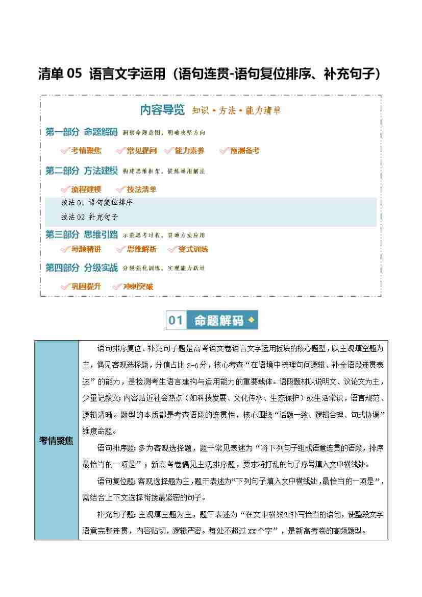 清单05 语言文字运用(语句连贯-语句复位排序,补充句子)(知识·方法·能力清单)(教师版)