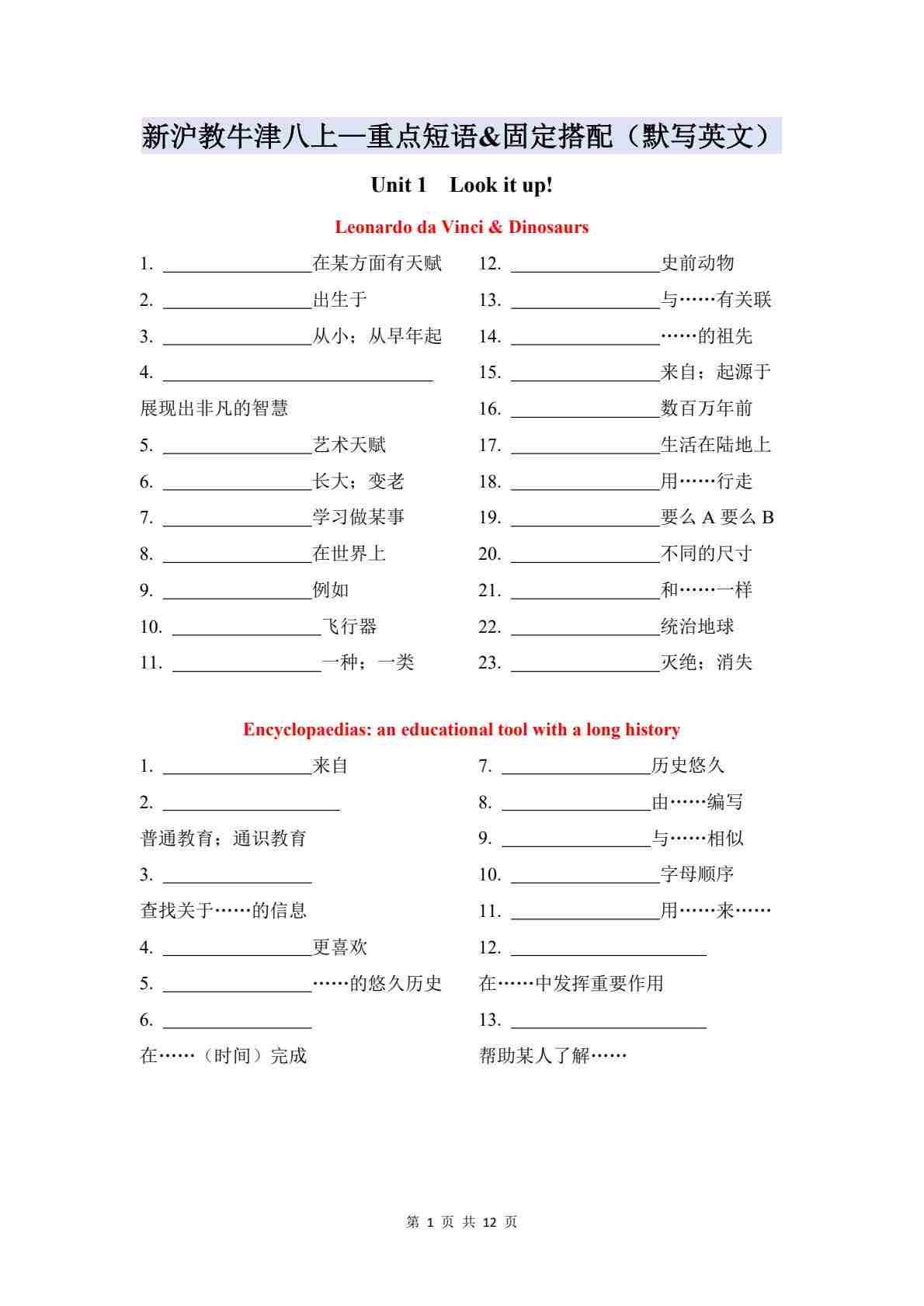 新沪教牛津八上—重点短语--固定搭配(默写---英文)