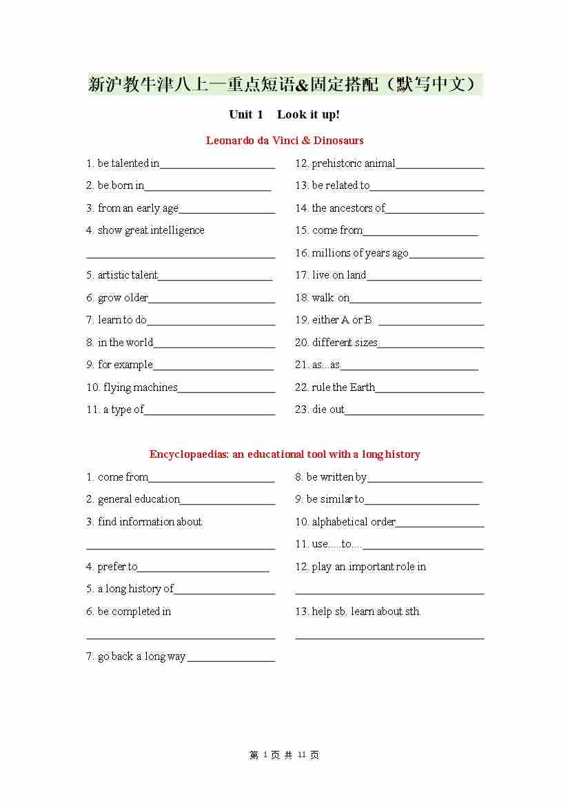 新沪教牛津八上—重点短语-----固定搭配(默写中文)