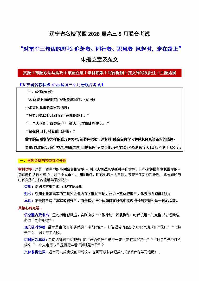 辽宁省名校联盟2026届高三9月联合考试“对雷军三句话的思考:追赶者、同行者、识风者 风起时,走在路上”审题立意及范文
