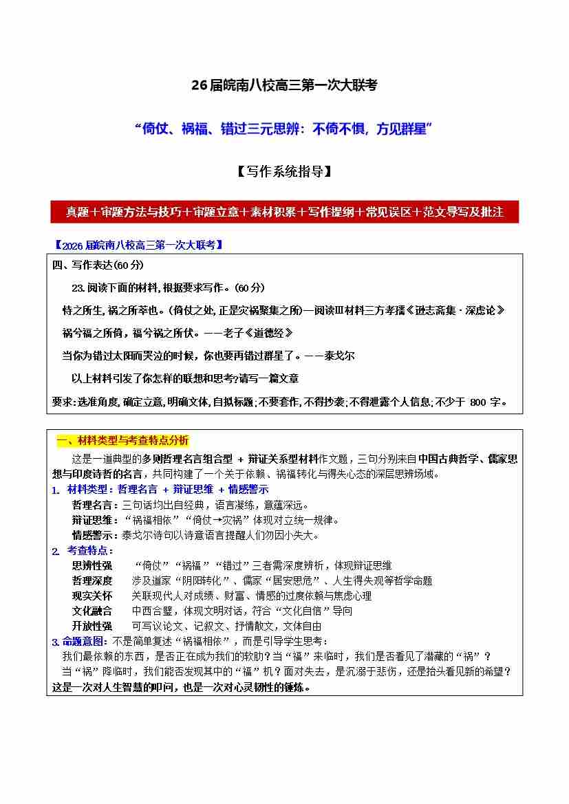 皖南八校高三第一次大联考“倚仗、祸福、错过三元思辨:不倚不惧,方见群星”