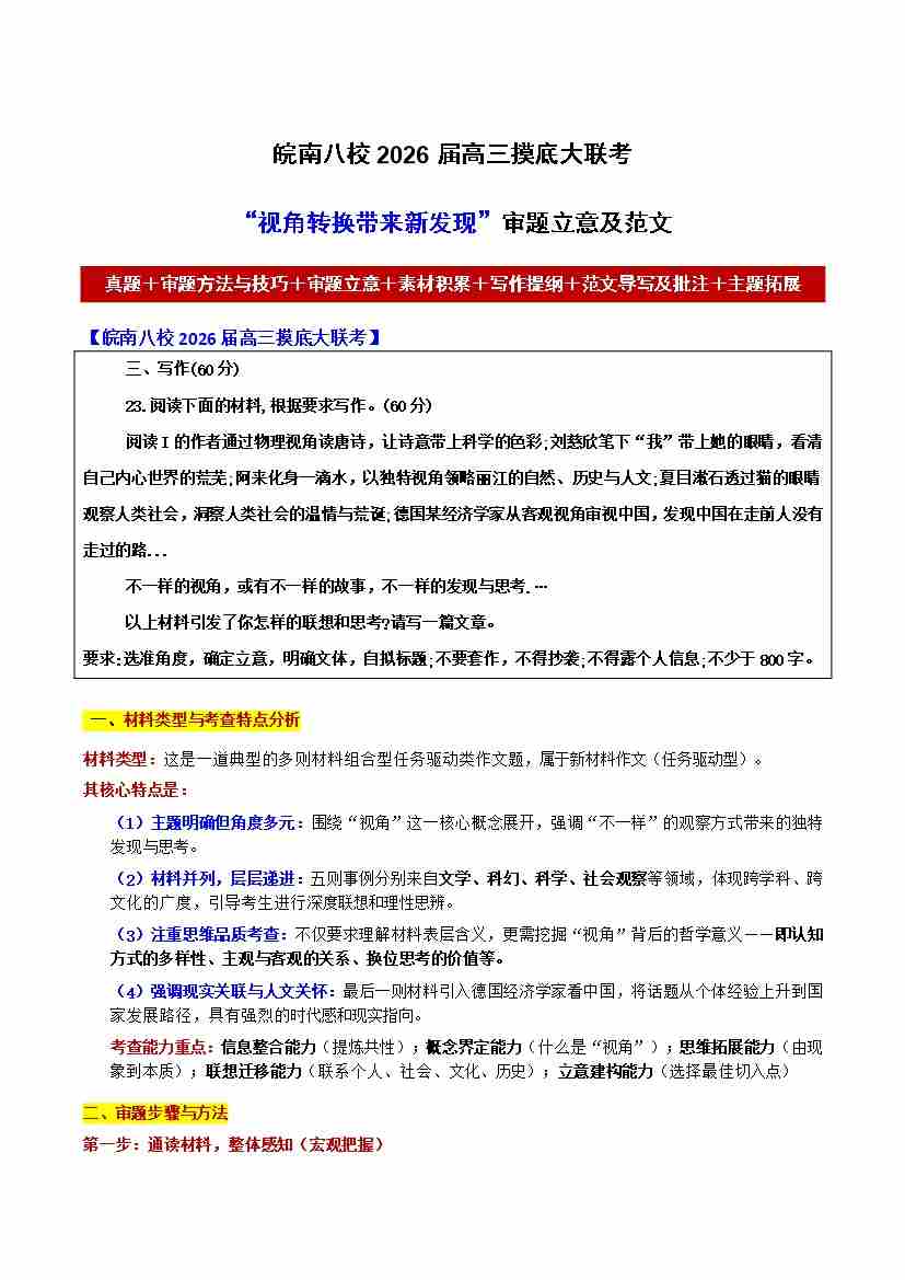 皖南八校2026届高三摸底大联考“视角转换带来新发现”审题立意及范文