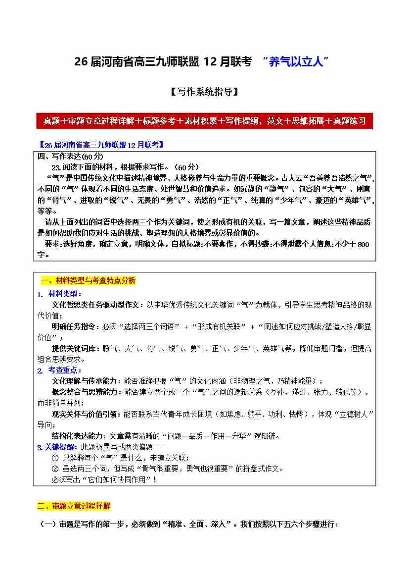 河南省高三九师联盟12月联考 “养气以立人”