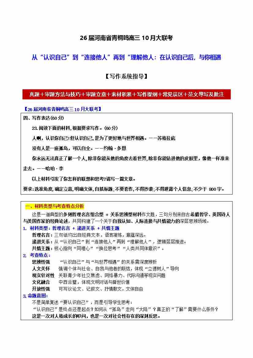 河南省青桐鸣高三10月大联考从“认识自己”到“连接他人”再到“理解他人:在认识自己后,与你相遇