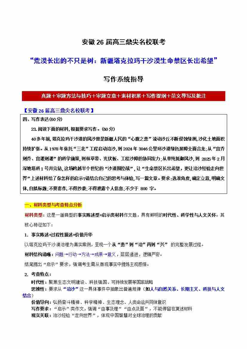 安徽26届高三鼎尖名校联考“荒漠长出的不只是树:新疆塔克拉玛干沙漠生命禁区长出希望”【写作系统指导】-备战2026年高考语文各地名校模考卷作文导写