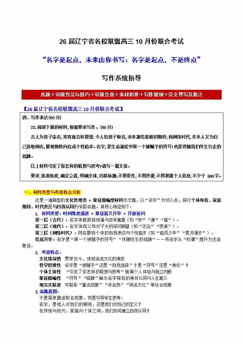 26届辽宁省名校联盟高三10月份联合考试“名字是起点,未来由你书写:名字是起点,不是终点”【写作系统指导】-备战2026年高考语文各地名校模考卷作文导写