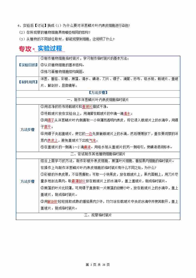 首页 > 全部 > 实验讲义 > 实验探究02 制作并观察植物细胞临时装片(解析版)