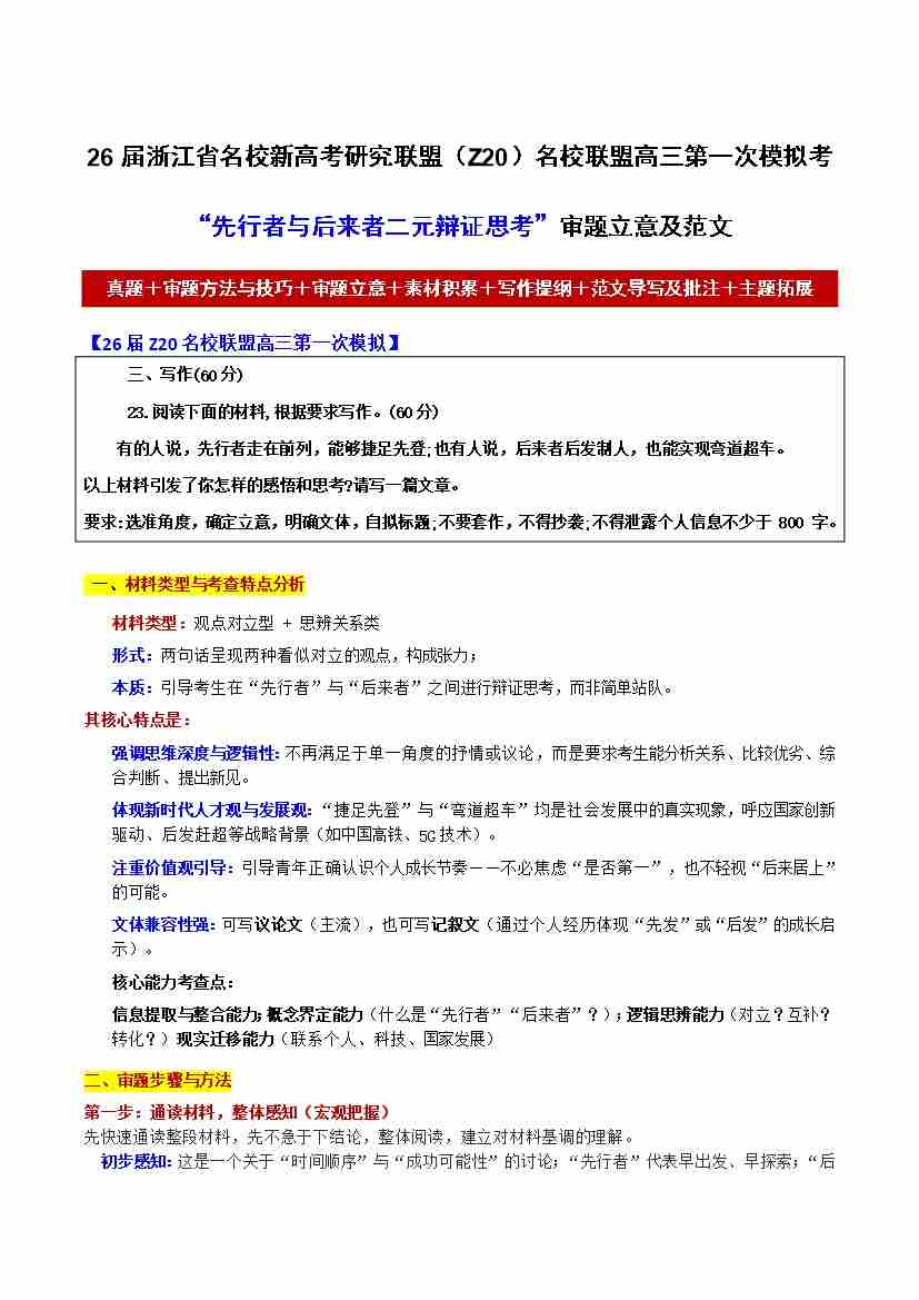 26届浙江省名校新高考研究联盟(Z20)名校联盟高三第一次模拟考“先行者与后来者二元辩证思考”审题立意及范文