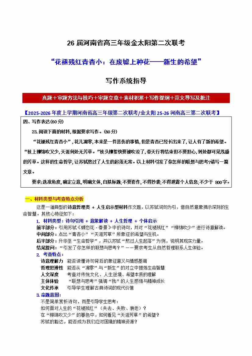 26届河南省高三年级金太阳第二次联考“花褪残红青杏小:在废墟上种花——新生的希望”【写作系统指导】-备战2026年高考语文各地名校模考卷作文导写