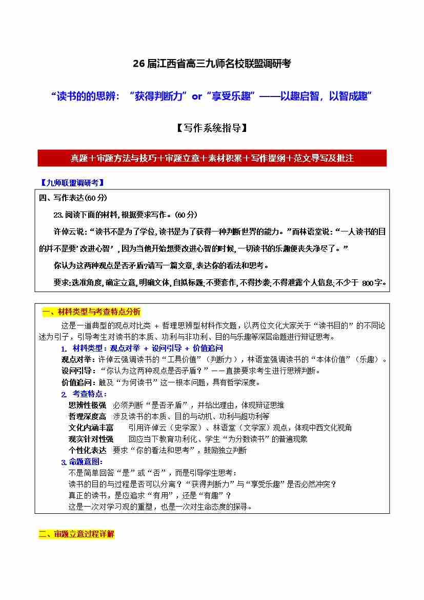 26届江西省高三九师名校联盟调研考“读书的的思辨:“获得判断力”or“享受乐趣”——以趣启智,以智成趣”【写作系统指导】-备战2026年高考语文各地名校模考卷作文导写