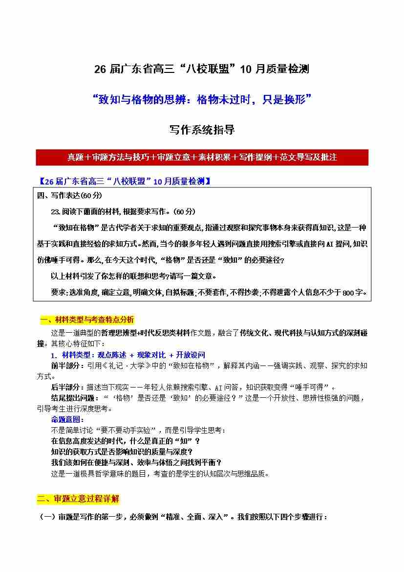 首页 > 全部 > 未知 26届广东省高三“八校联盟”10月质量检测“致知与格物的思辨:格物未过时,只是换形”【写作系统指导】-备战2026年高考语文各地名校模考卷作文导写