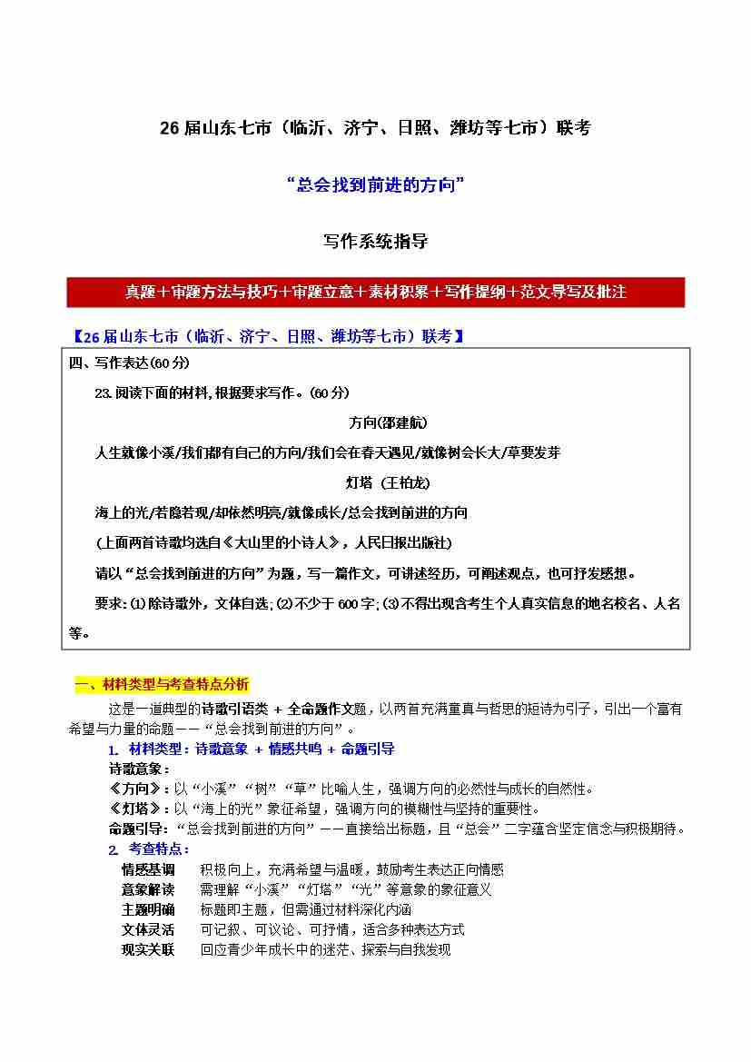 首页 > 全部 > 未知 26届山东七市(临沂、济宁、日照、潍坊等七市)联考“总会找到前进的方向”【写作系统指导】-备战2026年高考语文各地名校模考卷作文导写