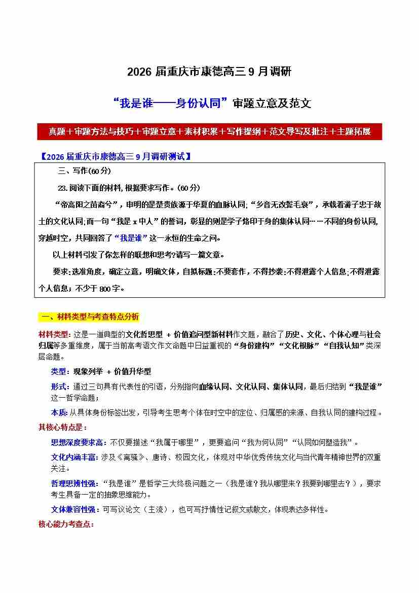 2026届重庆市康德高三9月调研“我是谁——身份认同”审题立意及范文