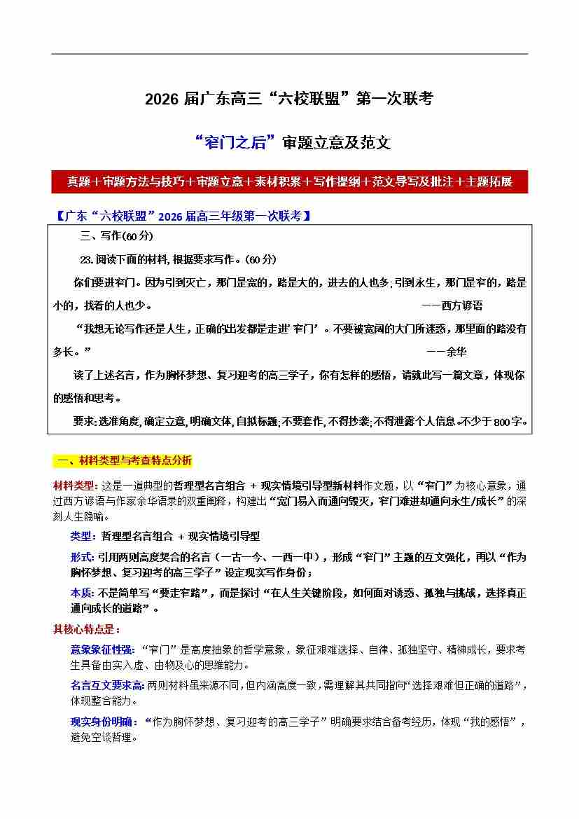 2026届广东高三“六校联盟”第一次联考“窄门之后”审题立意及范文