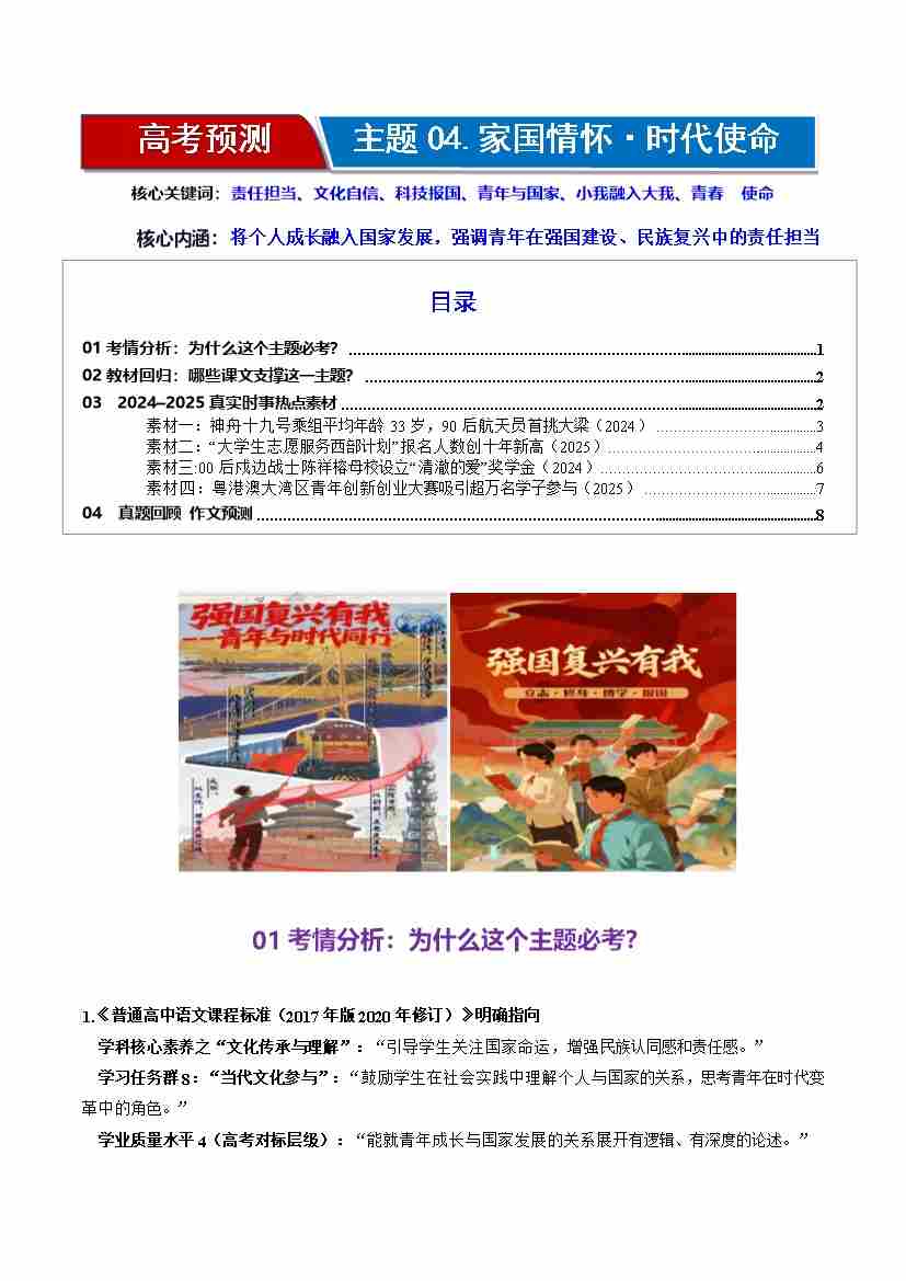 高考作文主题预测04:家国情怀·时代使命(回归教材、时事热点素材、真题回顾与训练)