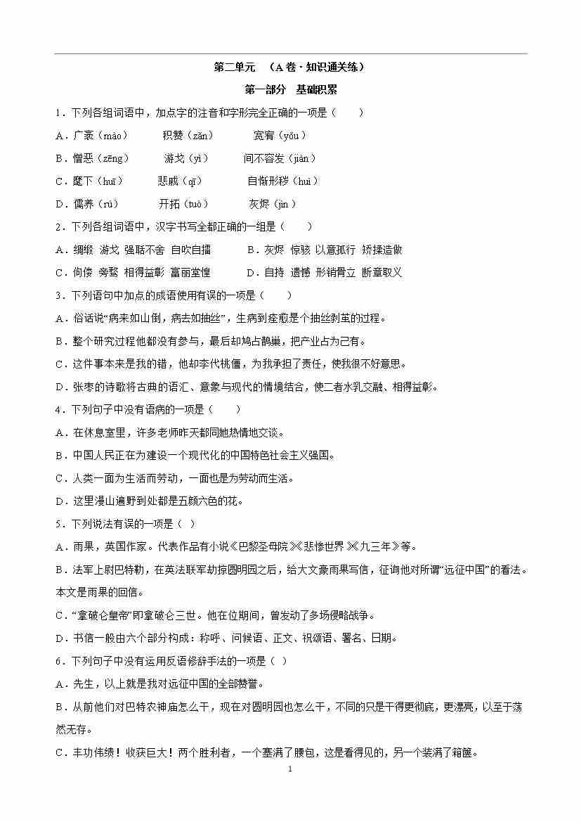 首页 > 全部 > 单元提升卷 > 第二单元检测(A卷•知识通关练)