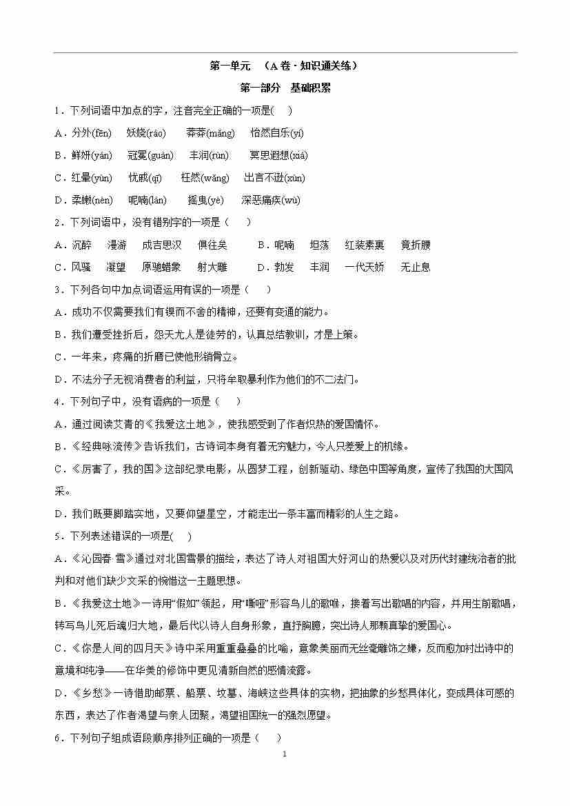 首页 > 全部 > 单元提升卷 > 第一单元检测(A卷•知识通关练)