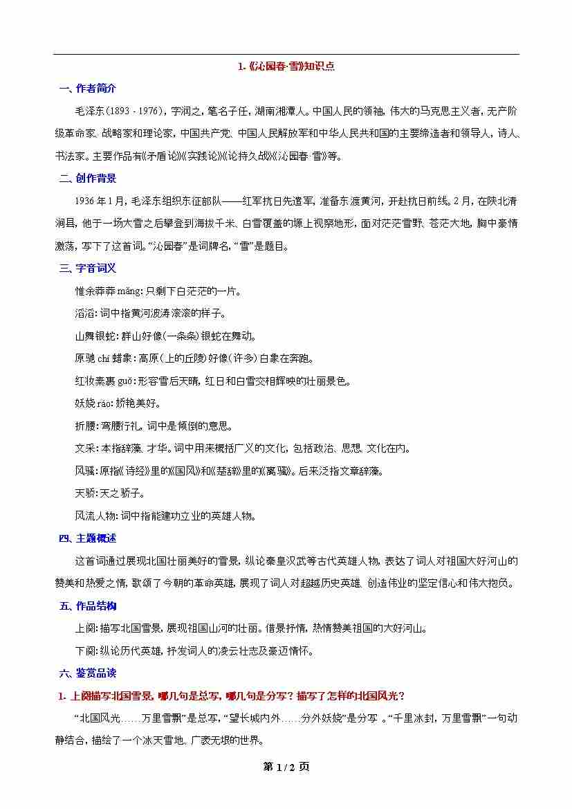 首页 > 全部 > 课本知识点 > 第1课 《沁园春·雪》知识点
